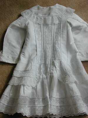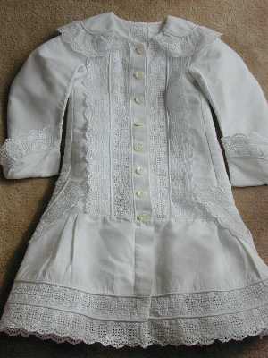 It is all hand made and bordered by two rows of lace at the hem and a row of lace around the collar and cuffs. The dress has all of its original buttons and the bodice section is decorated by rows of vertical lace. The dress measures 24" long and 9" from shoulder to shoulder.