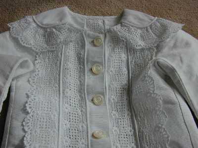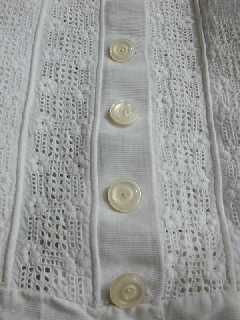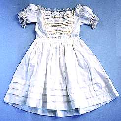 One of the cutest little girl's dresses I have ever seen! It is made of white cotton and trimmed with tucks and embroidered trim. The bodice is different from most that we have seen - the front triangle buttons to the shoulders and can fold down if desired. The buttons at the shoulders are mother-of-pearl. The embroidery at the waist is very elaborate and quite beautiful. In fact, the whole dress is quite a little beauty.