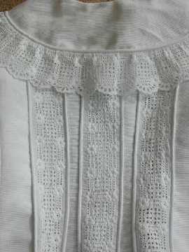 It has narrow lace edging on the sleeves, drawstring neckline, cartridge pleated skirt with a 1 1/4” waistband and two deep 2 1/2” growth pleats.