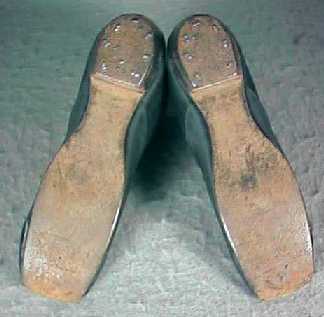 A delightful pair of circa 1860's child's straight sole black cloth shoes with 1/2" stacked leather iron nailed heels.