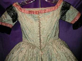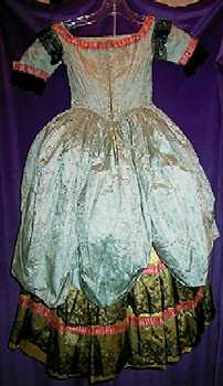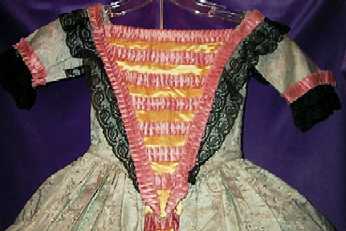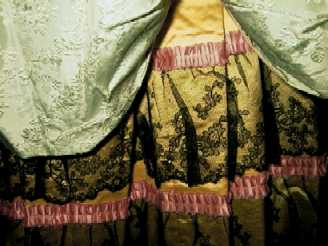 The majority of the dress is a celery green silk brocade. The overskirt has a balloon scallop appearance. This is achieved by pleating the overskirt in 4 areas 9 1/2” from the waist and by ruching (tiny pleating) the excess fabric into the waist. The underskirt and the “v” bodice insert is brilliant yellow and is trimmed with rows of pleated salmon silk.