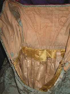 There is a doubled length of cotton threaded through the eyelets, but I would guess this was not what was originally used.There are cotton strings at the top of center back to tie it together. The bottom of the bodice has a double row of piping. The lower edge of the underskirt has three major stains and three minor ones. The lace hides obscures these stains. There are two small stains on the overskirt. They are very minuscule. The measurements are: chest-22”, waist-22”, underarm to waist-5 1/2”, from basque point (waist) to bottom of overskirt-18 1/2”, bottom of basque (waist) to hem-29”.