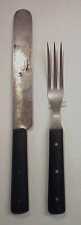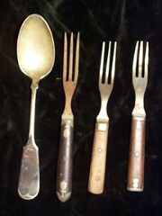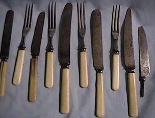 Period forks are generally skinny and have 3 prongs. I like to refer to them as "dieter" forks, because they take a long time to eat with (you know, they tell you to eat slowly when you're trying to lose weight!) Knives are very simple looking, but beware, they can be extremely sharp,especially the newer ones.