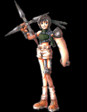 Yuffie Kisaragi:Although a direct descendant of an extremely tradition-bound ninja clan, she herself obviously has little concern for conventions as evident from her outfit. She forcibly joins Cloud's band of rebels to use them for obtaining a yet-undescribed object. She is shy and utterly self-centered, but her huge shuriken throwing star and her ninjutsu techniques should make her useful.