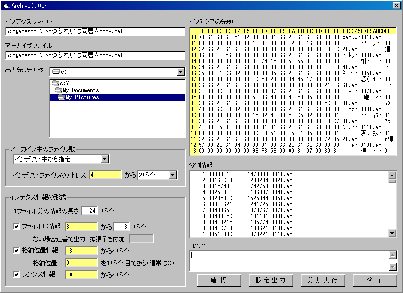 | 分割情報 | 確認ボタンを押した際に表示される 番号、オフセット情報、レングス情報、ファイルIDの順 |