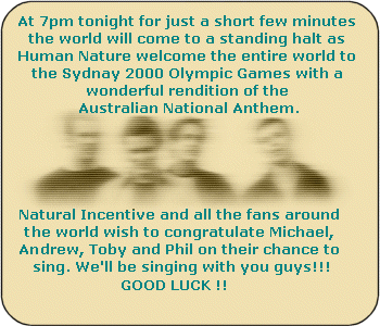 'Natural Incentive' was 'Celebrity Site Of The Day' yesterday! How exciting!!!! I've also just done a very quick update of the band news. Added some Olympics stuff. Everybody get your VCR's working for the opening tomorrow! GO HN!!!!