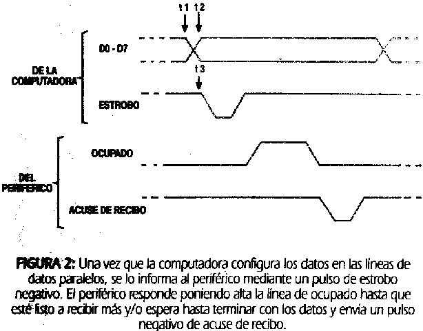 Los datos que salen por las Iineas D0-D7 comienzan a formarse en el tiempo t1 y se establecen y quedan listos para utilizarse en el instante t2. Un momento despues (t3) la computadora manda un pulso momentaneo negativo (Ilamado señal de "estrobo") al periferico, para indicar que los datos estan listos y en espera en las lineas de datos. Luego de t3, el perif6rico puede responder en una de dos maneras: puede tirar de la linea ocupada hasta que este listo para mas datos o puede esperar hasta que haya utilizado los nuevos datos y enviar entonces un pulso negativo de acuse de recibo a la computadora cuando desea mas.
