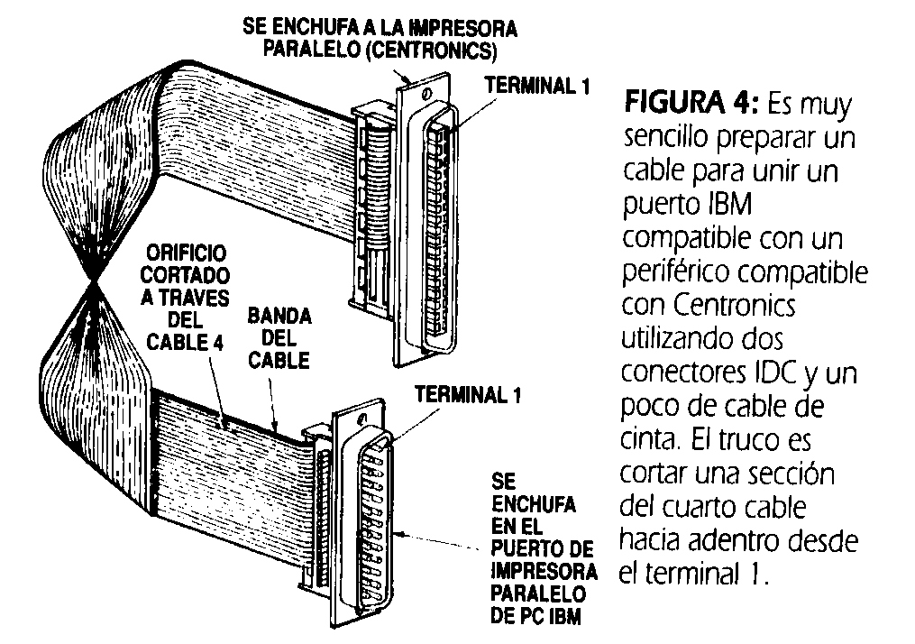 Observese que las conexiones de los terminales 1 -14 son conexiones de terminal a terminal. Si utiliza conectores IDC y cable tipo cinta de 25 conductores, puede aprovechar eso y crear un cable adecuado en pocos minutos. Comience posicionando el terminal 1 de ambos conectores sobre el mismo borde del conector de cinta (consulte la fig. 4) antes de apretarlos. Con esto quedaran 11 terminales sin conectar en el conector Centronics, lo cual es correcto. El truco consiste en cortar una pequeña seccion del cuarto cable hacia adentro a partir del cable del terminal 1. El circuito abierto permitira que la entrada de error de la computadora flote alta (en el estado "sin error') y ¡eso es todo!.