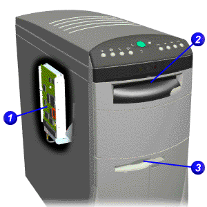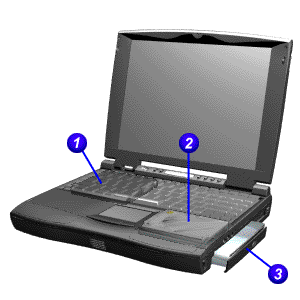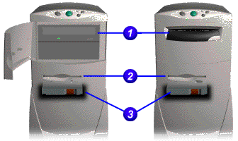 La unidad de disco duro (1) se encuentra adentro de la computadora y no es necesario obtener acceso a la misma. Puede obtener acceso a la unidad de CD (2) y la unidad de disquetes desde el panel frontal de la computadora. La unidad de CD consiste en un dispositivo de 5,25 pulgadas con una ranura cubierta o con una bandeja deslizable, un botón de carga/expulsión y un indicador de actividad luminoso. La unidad de disquetes (3) consiste en un dispositivo de 3,5 pulgadas con una ranura cubierta, un botón de expulsión y un indicador de actividad luminoso. Para ver la ubicación de estas unidades, seleccione la computadora de la