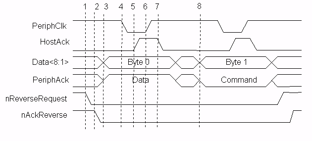 La primera figura muestra los dos ciclos de transmisión de datos directos, cuando HostAck esta activado indica que un ciclo de datos se esta llevando a cambio. Cuando HostAck esta desactivado se lleva a cabo un ciclo de comandos, los datos representan un calculo de RLE o un canal de direcciones. El bit 8 del byte de datos se usa para indicar una RLE, si el bit 8 es cero entonces los bits del 1 al 7 representan un calculo de la longitud de cadena de transmisión, si el bit es 1 entonces los bits 1 al 7 representan un canal de dirección.