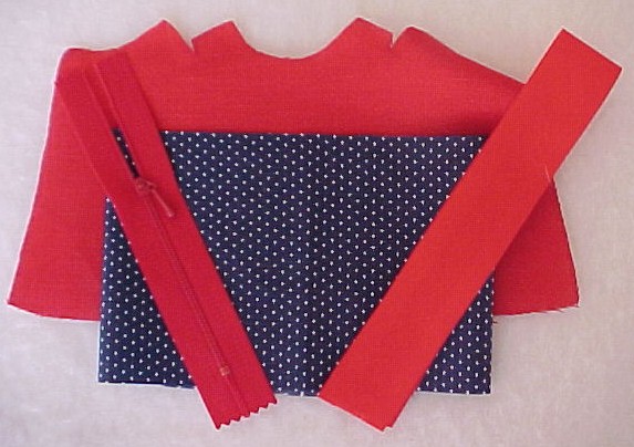 The original Beau Time was in red and blue taffeta plaid/check. The Fashion Paks featured a red bodice (some in the same red linen used in Matinee Fashion) with various skirt combinations (also several re-used from other outfits). Shown here is my sample which recreates the slim dropped waist top in red linen and features a skirt of navy with white pin dots as originally used for Gay Parisienne. It is finished with a large bow accenting the low waist. I used a 3" red vintage zipper--the sewing paq with zipper would include acustom 3" red coil zipper.