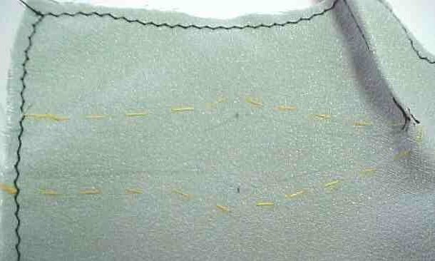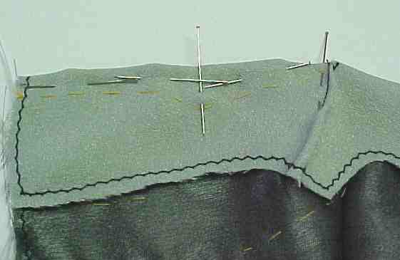 Pictures below show the stitching around the outside, pencilled darts, basting, pin marking and final results.
