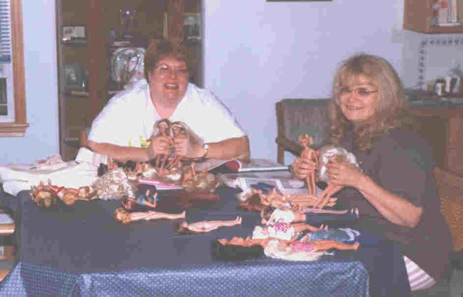 Bucket of Barbies (recreation) Now, three years later, I laugh at my "innocence"! These dolls were nothing really special, just the bent-arm, superstar face with messy hair. They have been fun to learn with though as later my best friend and I started having "Barbie Beauty Shop" days. But more on that later. Another link in the chain occurred about the same time. We had just moved into a new house and as I was unpacking I discovered my old patterns and newsletters from nearly thirty years before. What a rush! But also sad at the loss of my precious dolls. I know I had several Barbies—a blonde ponytail (I'm not sure which one, except it wasn't a #1), a redheaded bubble cut, a twist n turn, Francie, Skipper, Tutti, Old Ken (painted, not flocked) and New Talking Ken, Alan, Ricky, Julia, Crissy, Velvet, 12" Shirley Temple, GI Joe, 6" Cheerful Tearful, Kiddles and a several others. In all, I had about 100 dolls. As of now, I have replaced many of these dolls, but never expected to own any vintage. I was amazed at the value and interest in them today. But I have had a few astonishing finds, such as the 12" Shirley Temple for $7 (marked "old doll"), a Midge for 25 cents, a 1968 Talking Barbie wearing PJ's orange and pink dress for 25 cents, another Midge for $20 and a titian Bubble Cut for $25. I've also picked up several other dolls at good prices and always keep my eyes open and my "doll radar" tuned. What has been the most fun though came as the result of a "confession." About five months after all this started, I sheepishly said to my friend, Barbara, "You won't believe what I've been doing." Now, we had worked together earlier for about five years but occasionally got together for lunch. However, this disclosure was about to change things, big-time! She responded by telling me that her mother had come for a visit a while back and brought out her childhood dolls—a blonde #4 ponytail and a brunette Midge. She also had Shirley Temple, Ginny and some others. Wow! Well, that day has forever changed our lives. Barbara and her husband George have opened BGs DollHouse and are presently learning to repair and restore old dolls, as well learning to sculpt. We periodically have "Barbie days" which have included browsing antique malls and flea markets, having a beauty shop day where we clean up our finds, wash their hair, learned to reroot hair and eyelashes, try on clothes and brainstorm ideas. We are a club of two, partners in crime! If you don't have a doll buddy, you are missing out on a lot of fun. We are really like a couple of kids (just ask our husbands)!