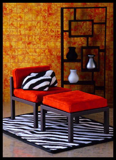 This contemporary set caters to the fashion-savvy. The uniquely minimalistic design features clean lines and has a definite retro/mod appeal. It is espresso with orange suede-look upholstery. |