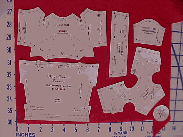 Pattern Layout (third in a series) When starting a project, wouldn't it be nice to sit right down and start sewing? Unfortunately, it doesn't work that way—sigh. In fact, actual sewing takes only a small part of our time when compared to preparations and finishing touches. Short-cutting these steps often leads to results that are less than our highly desirable expectations. My motto: You can't rush perfection!Grain Pattern pieces are laid out relative to the grain of the fabric. (Be sure that the grain lines noted on the original pattern are transferred to all working pattern pieces or templates.) If you are starting with a piece of yard goods that has a selvedge, then the grain is easy to see. The selvedge is the finished woven edge that runs lengthwise. This is the grain-line direction, i.e. "straight of grain" or "on grain." Some pieces are cut "on bias." Find the bias grain by folding the selvedge at a right angle to the crosswise threads. That folded edge on the diagonal is the bias grain. This edge stretches easily which is why bias trim is cut in this direction and hence, it's name. The bias grain allows give while the straight grain does not. Bias-cut skirts drape beautifully, but use care not to stretch sewing a bias seam. Sometimes a piece of fabric appears to be "off grain," that is, with woven threads tilted or skewed from straight. How does this happen? While weaving is always straight, it is sometimes pressed or rolled crooked on the bolt before it leaves the mill. If something is cut off grain—caused by either off-grain fabric or crooked pattern placement—the garment will never hang right or the fabric design will look wrong. This is especially true with directional prints, stripes or plaids. Off grain can be straightened by pulling or stretching diagonally across the bias (both ways until squared up) and steam pressing. If you wash the fabric first, then stretch to straighten and press.Knowing how to find the straight of grain becomes even more useful when you consider that many of us who sew doll fashions like to use up small pieces of leftover fabric. Simply put, to determine what is on grain, if you try stretching the (woven) fabric piece, here's what you will see: If it stretches, you are on the bias; if it does not stretch, this is the straight (or crosswise) of grain. Directional prints and stripes are, of course, easy to see. And don't forget to consider nap, whether it's velvet, corduroy, or knits, etc. (Refer to "Fabrics 101" in the last issue.) Cutting Layout Commercial patterns include diagrams that show the position of pattern pieces on a prescribed piece of fabric. Generally, I have found they are not always very useful and do my own thing. Many times I use leftover pieces of fabric that won't fit the diagram "ideal." And there can be other ways of laying out the pieces to save on fabric, especially if doing multiples. Also, fabric amount requirements are usually generous and the pattern layout does not always conserve fabric. My objective is not wasting fabric if I can help it. To figure your own placement layout and how much fabric will be needed for a particular pattern, lay all the pieces out. Eliminating "on fold" pieces (making a new complete piece that can be cut out flat, unless large) makes it easy to accurately position all pieces without cutting on the fold. If doing multiples, some pieces are easily "nested." For instance, the outer curve of a collar closely matches the inner curve and permits several collars without loosing virtually any excess fabric. Look for those pieces that complement each other for maximum economy. We'll cover multiples in more depth in a later installment. To estimate fabric requirements, I usually place all the pieces side-by-side. Look at the tallest pattern piece. A pencil skirt may require 5"-6". Below: Matinee Fashion pattern pieces laid out on leftover fabric. Note that the pencil skirt is about 5" while the bodice on bias needs about 6"