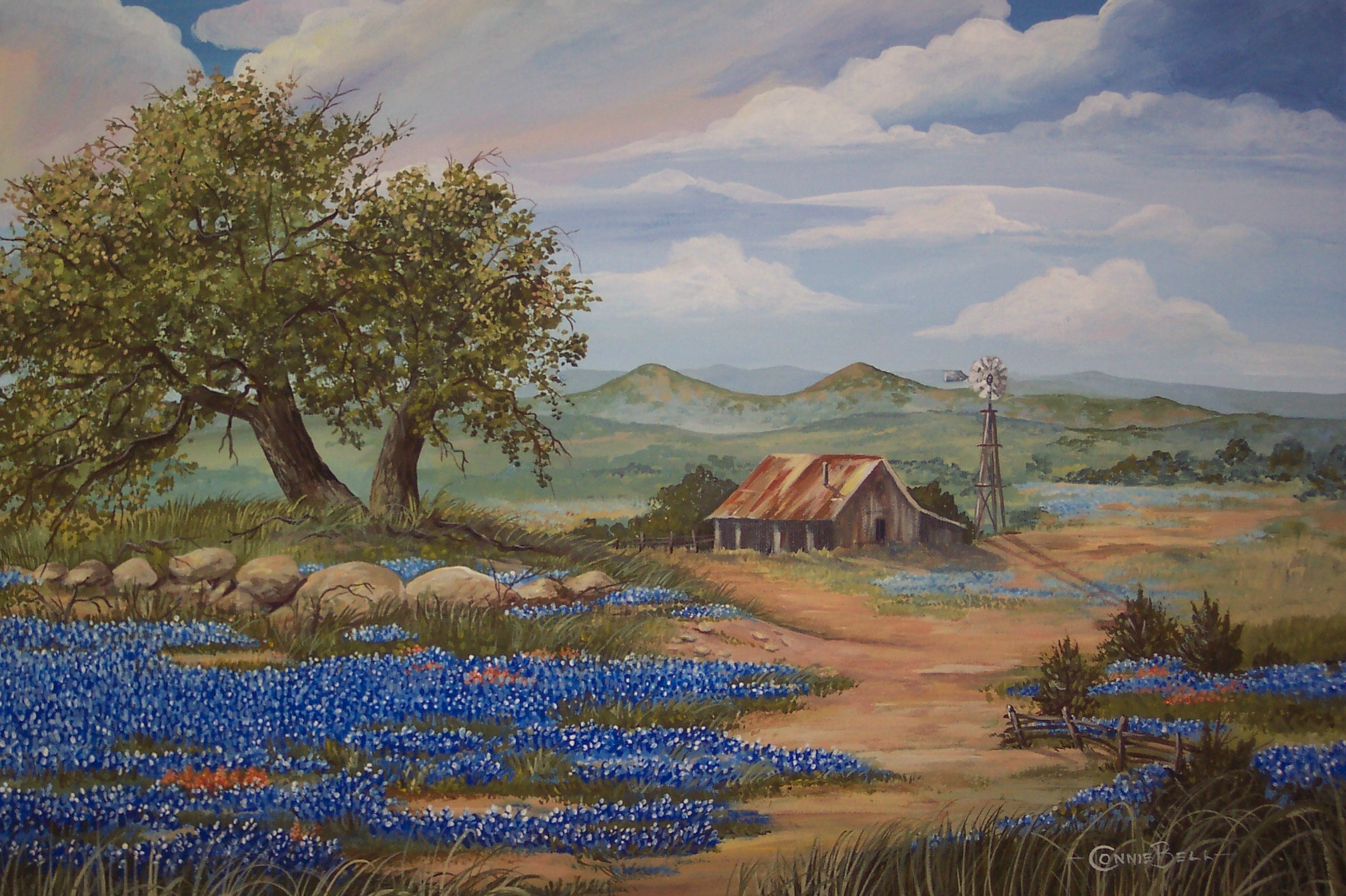 This is a painting of the Hill Country bluebonnet fields. It's titled TWIN PEAKS (after two such peaks in the Wimberley valley) and it is an acrylic painting 16" X 20".