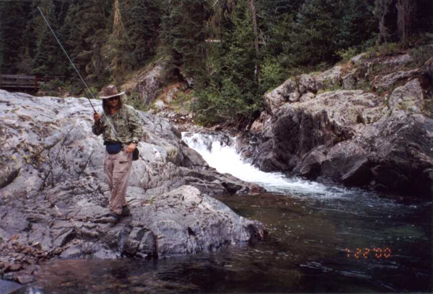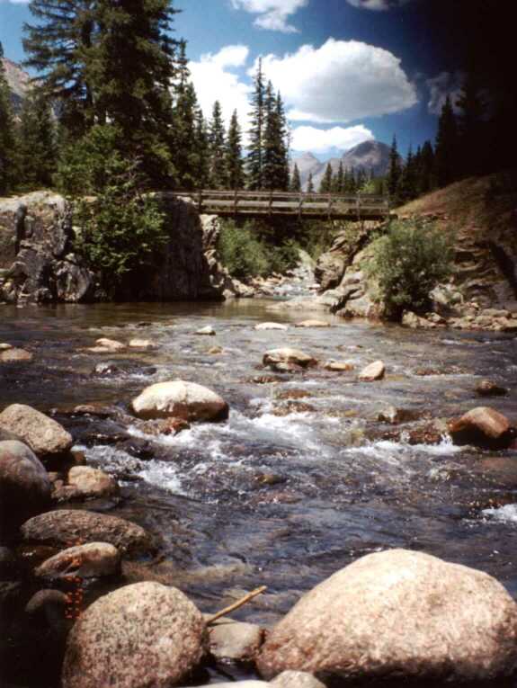 After catching our share of smaller fish in the pocket water near our camp, the next day we went in search of some deeper pools. The scoutmaster of the troop that decided to camp way too close to us said that there was a really deep pool up at the Johnson Creek Trail. We threw a lunch and our fishing gear into my pack, and hiked another mile and a half up to the bridge to check it out. Sure enough, it was very deep, and inhabited by some larger trout hiding 15 feet below the surface. We spent the day trying our luck for these trout, and exploring the area around the bridge. This area does not have as many good fishing areas as the pocket water below, but the views are just astounding. The Needle Mountains tower over you to the northwest, including the 14,000 foot Windom, Sunlight, and Elous peaks.