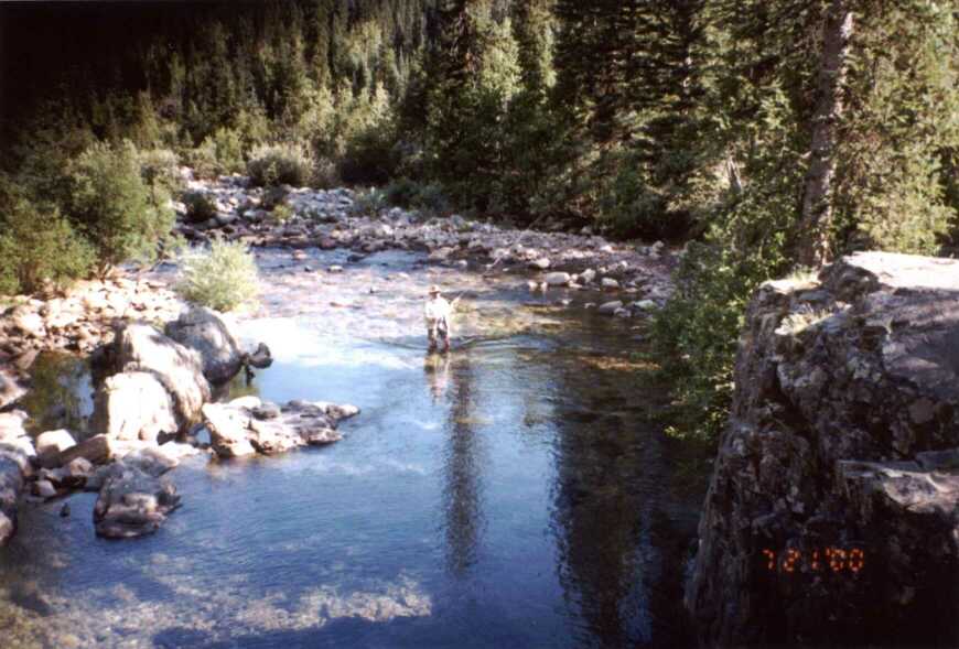 The first day, Tim Pinnow and I hiked up to Dead Horse creek, seven miles from the trailhead. At this point the creek opens into enough of a valley to provide ample campsite possibilities. This valley is lined with 12,000 foot ridges to the east, and 13,000 to 14,000 foot peaks to the west making for some spectacular views.