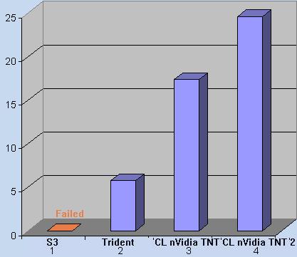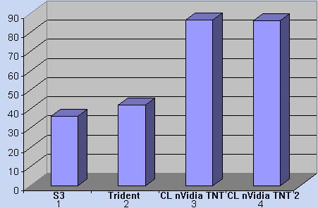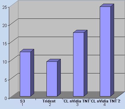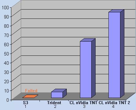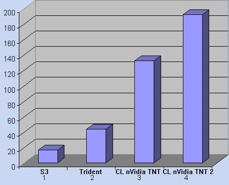 | Video Card | S3 Trio 3D/2X (362/368) w/ 4 Megs | Trident 3D Image 9750 AGP | CL nVidia RIVA TNT w/ 16 Megs | CL nVidia RIVA TNT2 Pro w/ 32 Megs |
