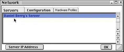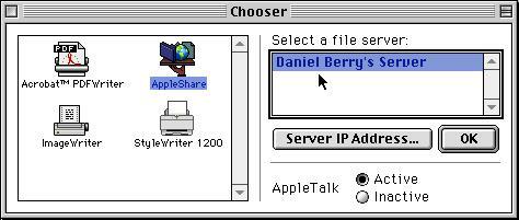 4. Click on the "Apple Share" Icon. 5. Do be certain that the AppleTalk selection is "ACTIVE." 6. If AppleTalk is inactive, then click on the active button to make it so. 7. Select the server which you wish to be connected to. 8. Click "OK." 9. Answer the questions on the next windows, by clicking "OK." 10. Click on the "name" dialogue box and type in the name of the Server which you will be connecting to. 11. Click "OK." 12.. Answer the questions on the next windows, by clicking "OK." 13. There are different types of Networks available, visit Doug's Networking Help, if you are selecting a different type of Network, such as "Peer to Peer," or "Direct Cable Connection." |