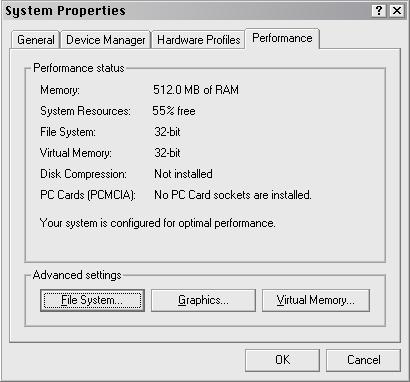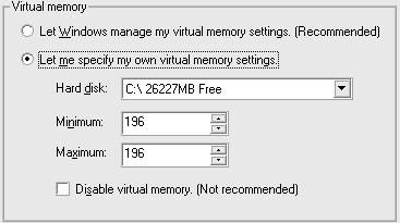 4. If you have more than 128 megs of RAM, set VM to at least 196 megs. 4a. If you have 64 megs of RAM, set VM to at least 224 megs 4b. If you have 32 megs of RAM, set VM to at least 256 megs. 4c. DO NOT DISABLE VM!
