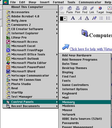 2. Click on the "Memory" text. 3. Click on the Virtual Memory settings. 4. If you have more than 128 megs of RAM, set VM to at least 196