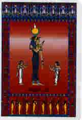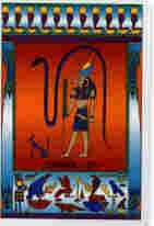 From the House of Temptation, we have Seth. Here we see the Ibis headed figure of Seth in profile. In front of him is Setekh, his companion animal. Seth wears the crown of Atum, and is shown with Apophis, the serpent and opponent of Re, coming from behind him and rising over him. In a reading, Seth indicates the temptations of the devil: bad influences, loss of spirituality, too much attention being paid to the material world. Narrowness of vision is acting as a block to progress.