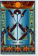 From the house of Change, we have the Scarab. This hieroglyph fascinates me more and more, every time I see it. The Scarab in this illustration is the funerary scarab of Tutankhamun. The solar disk above the scarab pictures the boy-king being accepted into the afterworld by Thoth and Horus. Wild lapwings sit at the base of the scarab, while on either side we see the combined Djed-Pillar, staff, crook and flail of the pharaoh. In a reading, the Scarab indicates joy and contentment coming from achievement and success.