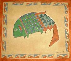 Title: "Isletta Pueblo Fish" Painted and dyed fabric on 20" square pillow cover