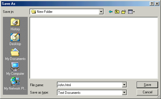 Opening Your File Now there’s 2 ways to open up the file you just saved. One way is you could go directly to the file on your computer, and double click on it to open the browser. Or you could open your browser, and in your browser choose file, under file choose open. In the open dialog box choose the file you saved and click open. Now you can play around with this, and try saving and opening files, remember how to do this because in the next lesson you will be learning how to write HTML codes, and you will need to know how to save and view your web page in a browser. So go, go test out what you know and get a good night sleep to let it all sink in, come back tomorrow and will get started on the coding. Privacy Policy | Trademark Notices | User Agreement © 2001 TheHTMlSource.com, INC. All Rights Reserved. |