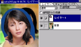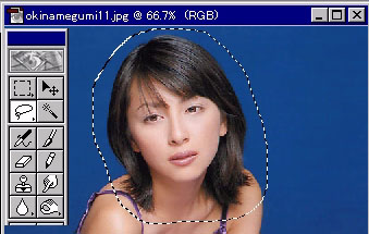 | アイドル画像の方をクリックして選択し、顔の必要部分 を範囲設定します。 今回は簡単に首から上をすべてすげ替えます。 範囲設定する方法は何でもいいですが、後から消すの が、楽なように投げ縄ツールを使うのがいいでしょう。 周囲も含めて少し大き目に選択範囲を作ります。 |