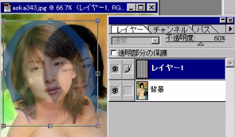 | ・レイヤーパレットでアイドルの顔のレイヤーが選択 されていること(青色で表示)を確認します。 ・重ねあわせを見るためにレイヤーの不透明度を 60%くらいにします ・上のレイヤーメニューの中の自由変形を選ぶと 顔画像の周りに四角い枠が表示されます。 マウスのポインタを中に入れると移動、 線上の四角の場所に持ってくると拡大・縮小、 外にすると回転の操作ができます。 ・全体の大きさ、顔の輪郭、目・口の位置などを参考に 変形・移動を行い最後にダブルクリックで確定させます。 (縦横比を一定にして縮小するにはshiftキーを 押しながら縮小します) |
