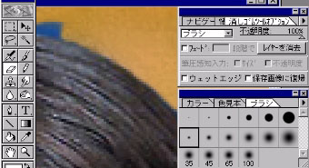 | 消しゴムツールで周辺部の余計な部分を消します 失敗してもいいようにレイヤーの複製をしておきます。 ・ブラシのパレットを表示させ、最初は大き目のブラシ を選び境界が少し残るくらいまで消します。 ・その後小さいブラシを選び、画像を拡大して境界を 丁寧に消して行きます。 ・写真屋の場合、ブラシオプションの上1段はぼかし のない形状です。必ず、ぼかしが入った形状 (2段目以下)を選ぶようにしましょう。 |