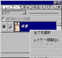 | 2.レイヤーの複製 レイヤー>レイヤーの複製を選ぶか レイヤーパレットで青く表示されているところで 右クリックし、レイヤー複製を選んでレイヤーの 複製を作ります。 |
