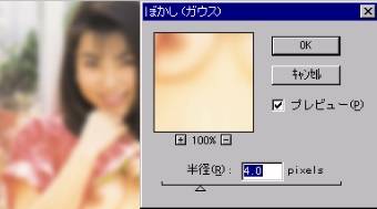 | 3.上のレイヤーのぼかし処理 レイヤーパレットで上のレイヤーを選択し フィルタ>ぼかし>ぼかし(ガウス)を選びます。 半径は4くらいでぼかしをかけます |