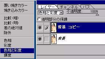 | 4.色相と彩度モードでの合成 上のレイヤーの描画モードのところの▼ をクリックし、色相と彩度モードにします |