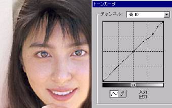 | 5.カラー画像での修正 表示をRGBカラーに戻すとほぼ同じ色合いに なっているはずです この後の微調整はカラー画像で変化を確認 しながら行います 右の例では、頬の部分に青みが目立つので 青チャンネルの該当する部分の値を少し 下げています 元画像とアイドル画像で髪の色が違う場合 肌は輝度の高いところ(トーンカーブの右側) 髪の毛は輝度の低いところ(左側)なので 右半分を変化しないようにプロットしておき、 左側のみを調整して髪の色を合わせます。 明暗の差が少ない時や確実に分離したい時は 髪の毛だけを範囲指定してマスクを作り 効果を限定すればよいでしょう |