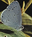 De onderkant van de vleugels is effen lichtblauw met zwarte vlekjes.