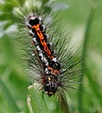 De volwassen rups heeft de kenmerkende zwart-wit-rood-tekening.