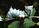 Jonge rupsen vreten skeletten in het blad, later vreten ze vanaf de bladrand.