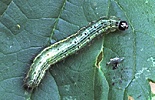 Het rupsenlijf is grasgroen en onbehaard met witte lengtelijnen