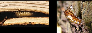 Na de ontpopping steekt het poppenomhulsel buiten het hout.
