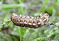 De rups verpopt in een ijle cocon dicht bij de grond.