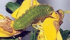 De tot 20 mm lange rups heeft een helder geelachtig groen lijf