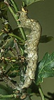 Jonge rupsen zitten op de bladonderkant, later tegen takjes.