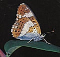 De ondervleugels zijn roodbruin met witte vlekken en zwarte stippen.