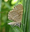 Vaak rust hij op de onderkant van een blad, vaak met de vleugels opgeklapt.
