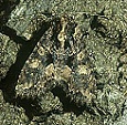 Hij is gemarmerd op de bovenzijde en de onderkant is veelal groenachtig.