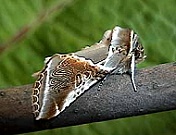 De voorvleugels zijn bruin gemarmerd en de combinatie
