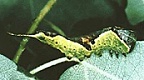 De jonge rups zit graag in de zon op de bovenkant van een blad.